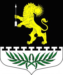 «В черном поле с серебряной костыльной оконечностью, обремененной двумя зелеными ветвями ивы накрест- золотой восстающий и обернувшийся лев, держащий в правой передней лапе серебряную стрелу в столб, наконечником вверх, держащий в пасти золотое солнце (без изображения лица) «.